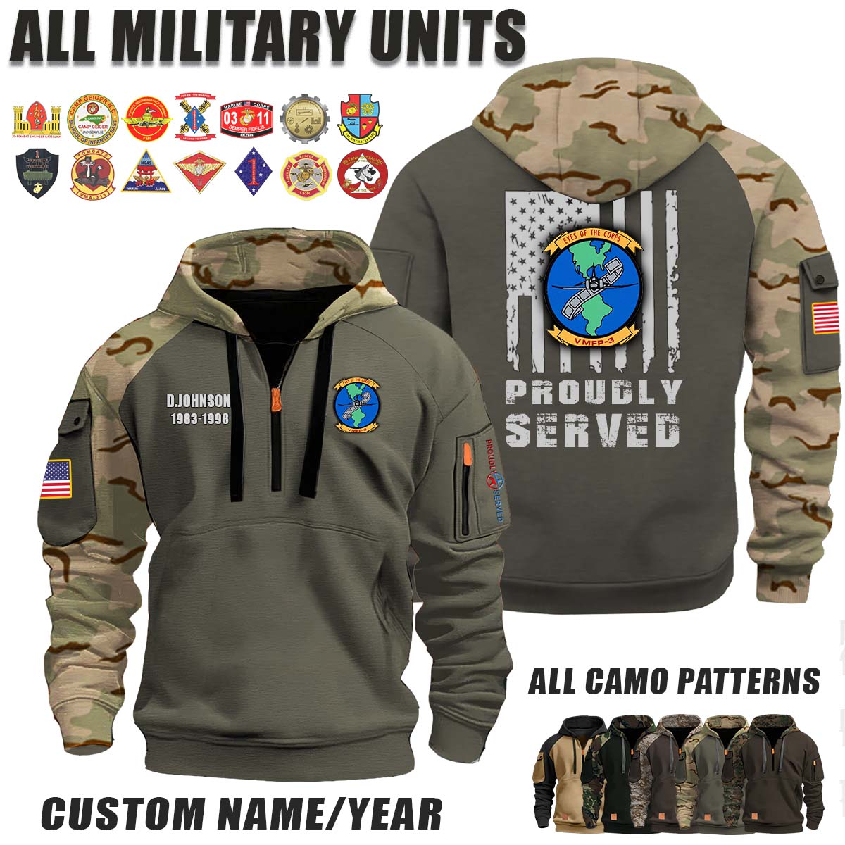 This VMFP-3 Eyes of the Corps_Camo Halfzip Hoodie lets you customize your Branch, Unit, Role, Rank, and Years Served — so your service, sacrifice, and pride live on.