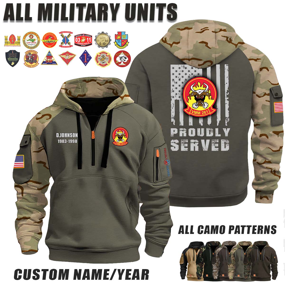 This VMM-261 Raging Bulls_Camo Halfzip Hoodie lets you customize your Branch, Unit, Role, Rank, and Years Served — so your service, sacrifice, and pride live on.