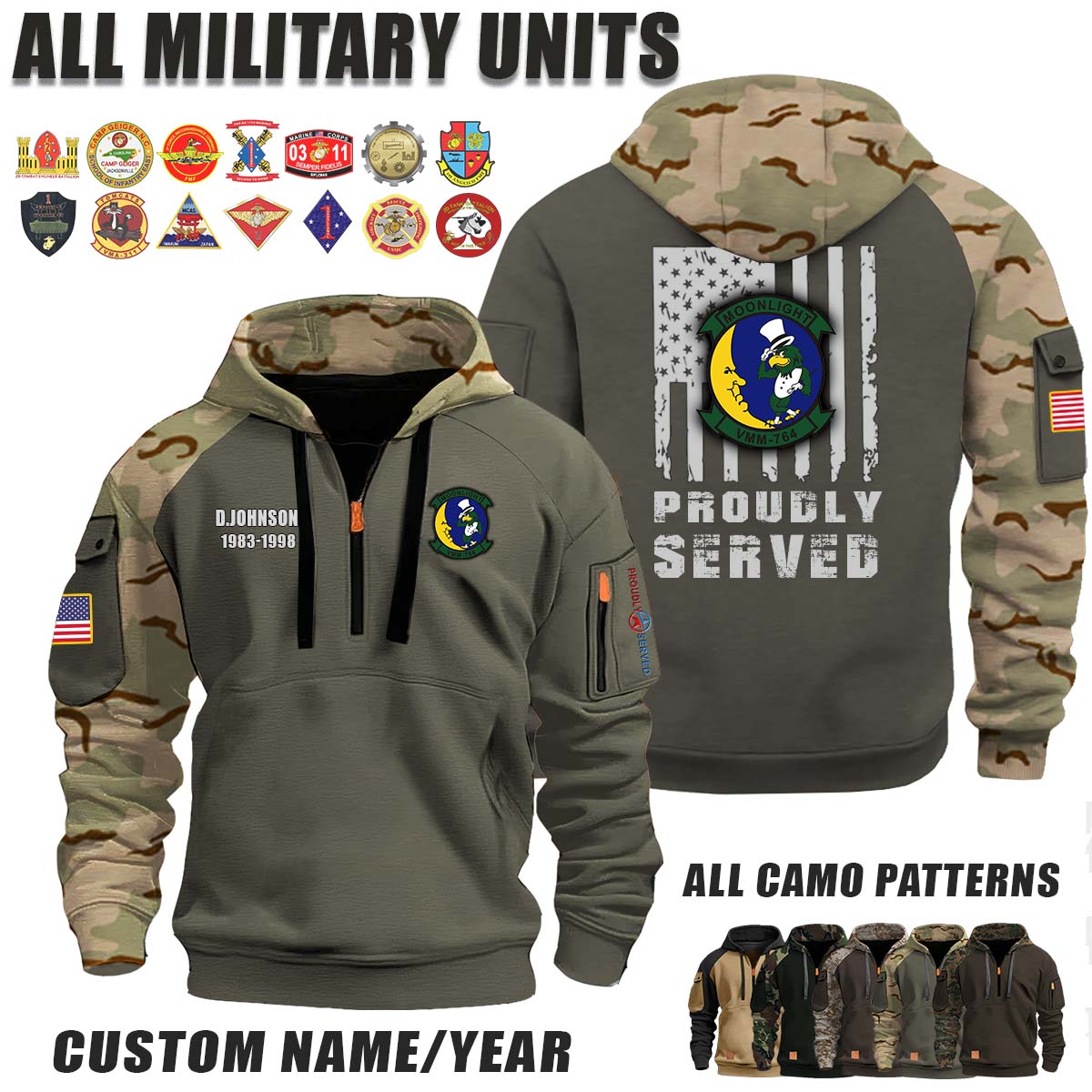 This VMM-764 Moonlight_Camo Halfzip Hoodie lets you customize your Branch, Unit, Role, Rank, and Years Served — so your service, sacrifice, and pride live on.