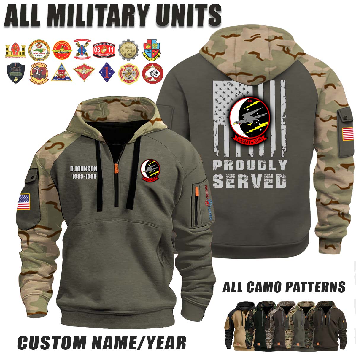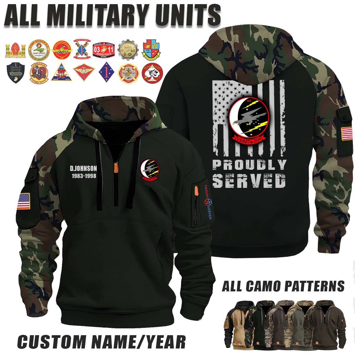 This VMMT-204 Raptors_Camo Halfzip Hoodie lets you customize your Branch, Unit, Role, Rank, and Years Served — so your service, sacrifice, and pride live on.