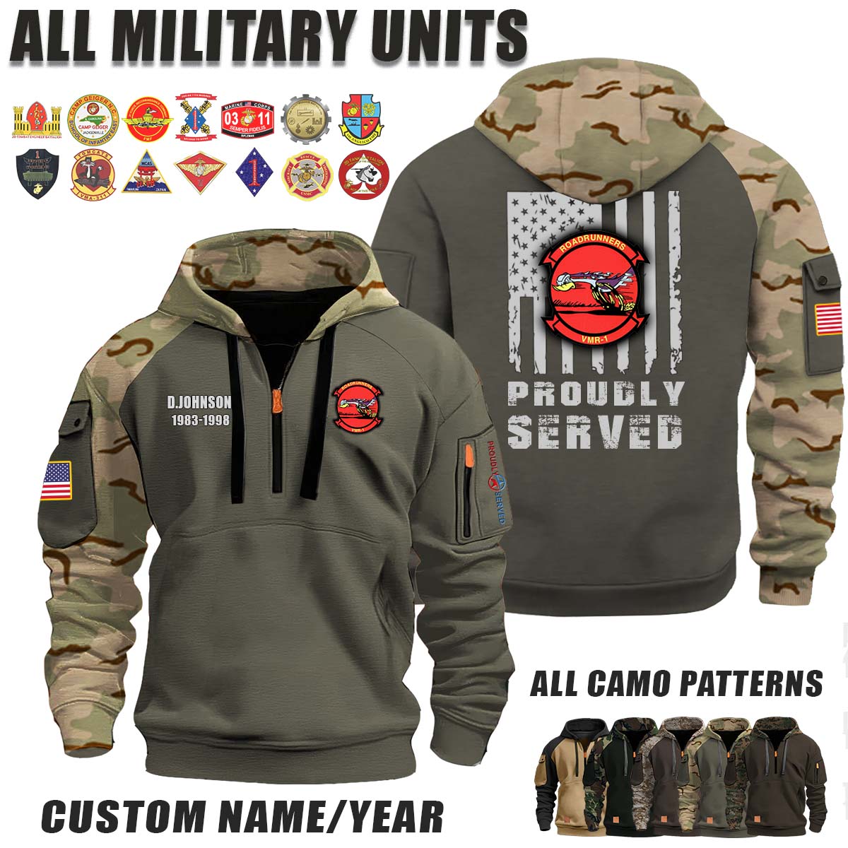 This VMR-1 Roadrunners_Camo Halfzip Hoodie lets you customize your Branch, Unit, Role, Rank, and Years Served — so your service, sacrifice, and pride live on.