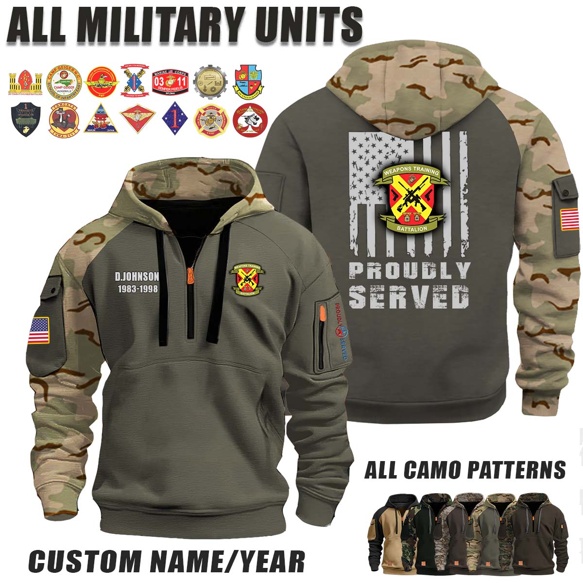 This Weapons Training Battalion_Camo Halfzip Hoodie lets you customize your Branch, Unit, Role, Rank, and Years Served — so your service, sacrifice, and pride live on.